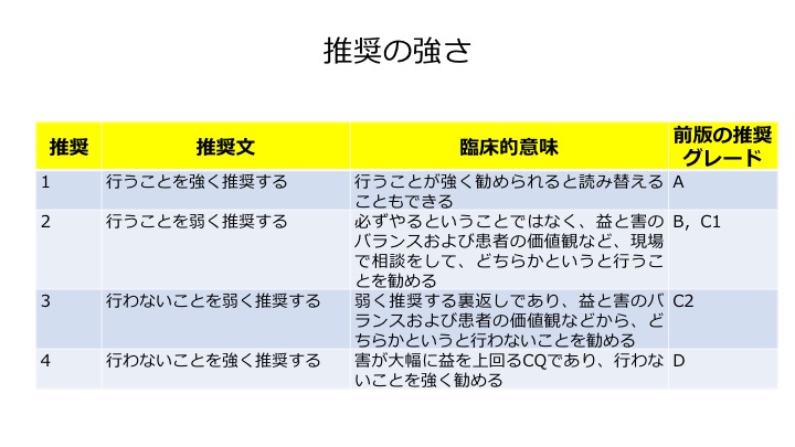 また、ガイドライン作成といえば、推奨度を議論する推奨決定会議は、専門家集団の医師のみで行っているのが通常だが、2018年版では、看護師1人、薬剤師1人、患者代表2人を加えて行ったというのが今までにない画期的なやり方だ。そして推奨度を〝強く推奨する〟から 〝やるべきではない〟まで4段階で評価した(図4)。