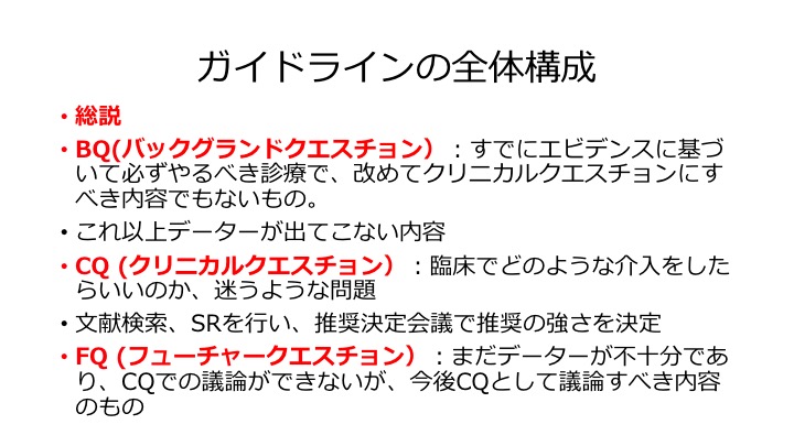 一方、現時点ではデータの不足により明確なエビデンスはないが、将来的に期待できる治療についてはFQとし、将来の課題として検証し続けるべき治療と位置付けた。