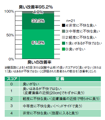 臨床試験の結果は明らかだった。新たにがん性皮膚潰瘍を起こし、臭いが発生した患者さん21人に対し、1日1~2回、14日間メトロニダゾール外用薬を塗布したところ、20人(95.2%)で臭いが改善した。改善の度合いは劇的で、13人(61.9%)が「臭いがない」、7人(33.3%)が「臭いがあるが不快ではない」。残る1名も「中等度に不快な臭い」との評価だった(図2)。