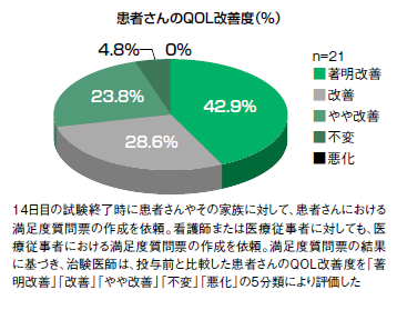 そして、QOL全般の改善度は、21人中15人(71.5%)で「著明改善」(42.9%)または「改善」(28.6%)と評価された(図3)。
