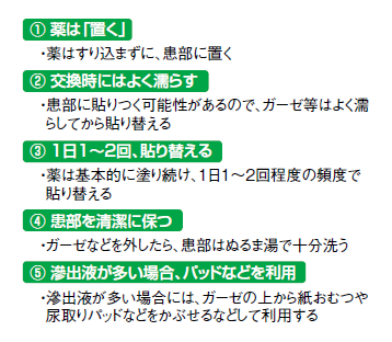 すり込む薬ではなく、「患部の上に薬を置くイメージ」(渡部さん談)なので、ガーゼなどの上に厚く塗って貼るか、患部にすり込まず置き、ガーゼなどで覆う。