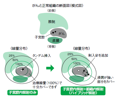 「3次元に計画を立てることができても、やはり不整型の腫瘍など治療が難しい症例はあります。均一に広がった腫瘍、つまり同心円上に広がるような腫瘍であれば、通常の腔内照射方法でも対応できますが、形が不整な場合などでは、高線量を投与できる領域から腫瘍の辺縁が外れてしまい、腔内照射のみでの治療が難しくなる場合があります。そこで考えられているのが組織内照射の併用です」