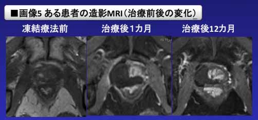 「1例を挙げると、前治療から5年を超えたころPSA値が上がり始め3.5を超えたので造影MRIをしたら、ほんの小さく造影されました。つまり、がんが見えたわけです。その場所を狙って針生検をしたら、22本中1本に陽性が出たので、凍結療法を行いました。その後2年経ちますが、経過は順調。PSA値も低いままなので治癒に向かっていると思います」