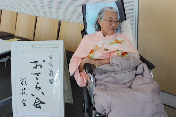 4月29日(金)晴 『市川左団次門下 萩井流花萩会素踊りおさらい会開催のご案内』という、長いタイトルの葉書が母のアパートに来ていた。行きたいかと聞くと、母はコクンと小さく頷(うなず)いた。主催者に電話をしたところ、会員ではないのだが、毎年来てくれるので今年も招待したとの事であり、介助を手伝ってもらえるか否かを尋ねると快諾を得、着物を粧(めか)して出かけてきた。