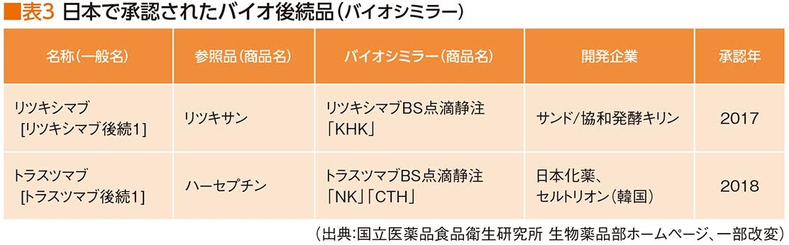 乳がんや胃がんの治療で使われるトラスツズマブのバイオシミラーは、2018年3月に、日本化薬と韓国の製薬会社であるセルトリオンが承認を得た。ただし、適応は胃がんだけで、乳がんは含まれていない(表3)。