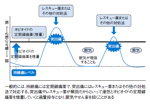 一方、定期鎮痛薬の切れ目に起こる突出痛は、投与量が不足していることが原因と考えられるので、オピオイドなどの鎮痛薬を増量して対処する。