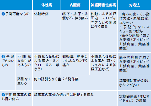 一時的に起こる突出痛に対しては、突出痛のタイプを明らかにし、それに応じた治療が行われる。突出痛のタイプとしては、予測できる突出痛、予測できない突出痛、定期鎮痛薬の切れ目の突出痛がある(表5)。