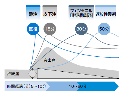 「突出痛は痛み始めてから5~10分で痛みのピークに達し、10~60分で収束することが多いと言われています。ところが、経口速放性製剤は、効果がピークに達するまでに50分位かかってしまいます。それに比べ、フェンタニル口腔粘膜吸収剤は、効果が現れるのが速いのが特徴です。10~15分で効果を実感でき、効果のピークに達するのも30分後です。また効果の持続時間が短いため、薬の作用がいつまでも残って、眠気が持続してしまうような心配もありません。